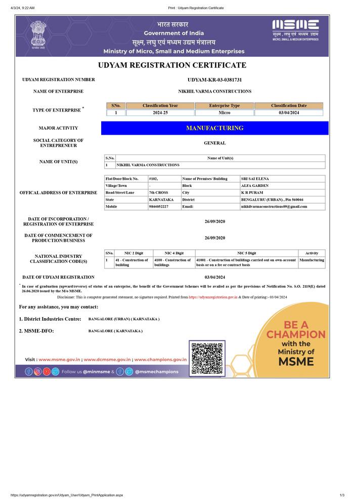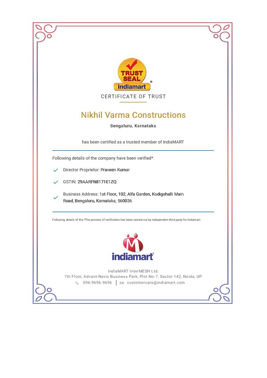 Nikhil Varma Constructions is a Bangalore-based company established in 2020, delivering reliable and high-quality construction solutions. Guided by Trust, Transparency, and Time-Bound delivery, we ensure every project is completed with precision, quality, and professionalism.